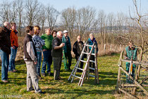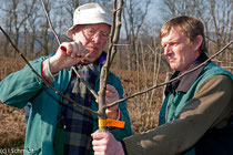 Der diesjährige Schnittkurs fand bei strahlendem Wetter auf dem NABU-Obsthof in Fütig statt. Gärtnermeister Ingo Milewski stellte an einem mitgebrachten Baum, der anschließend gepflanzt wurde, den Schnitt von Krone und Wurzeln dar. An etwas älteren Bäumen konnten die Teilnehmer unter Anleitung selber üben. Geeignetes Werkzeug wie Hippe, Amboßschere, Astsäge und Stangensäge wurde vorgestellt. Eine lebhafte Diskussion entbrannte am Obstbaumkrebs; selbst radikale Methoden wie Karbolineum und Bunsenbrenner wurden von Teilnehmern als hilfreich vorgeschlagen.
