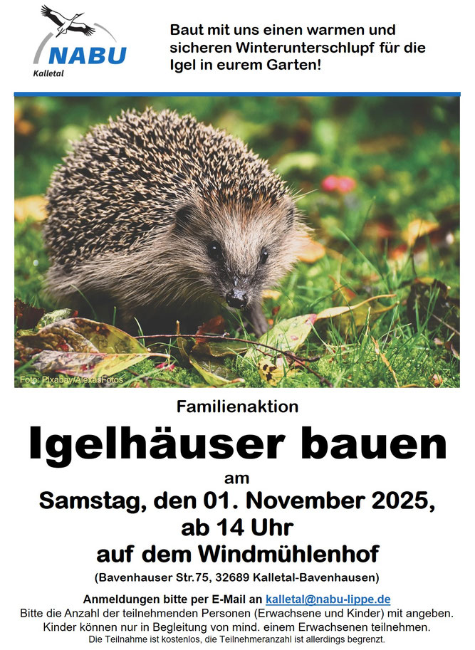 Die NABU Gruppe Kalletal trifft sich jeden 2. Mittwoch im Monat um 19:00 Uhr im Dorfgemeinschaftshaus Kalldorf (Am Mühlenteich 1, 32689 Kalletal). Interessierte sind jederzeit herzlich willkommen! Weitere aktuelle Termine finden Sie hier auf der Webseite.